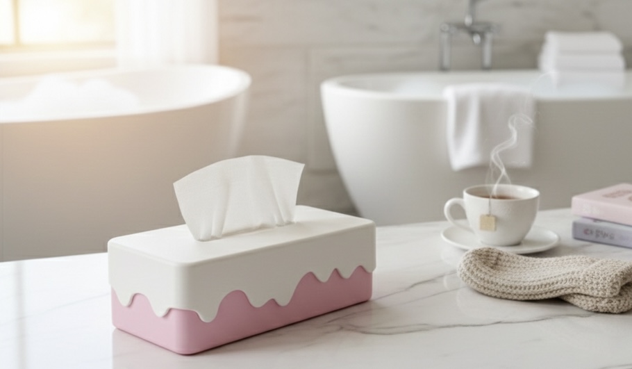 Caixa de lenços com tampa branca ondulada sobre base rosa e lenço branco visível