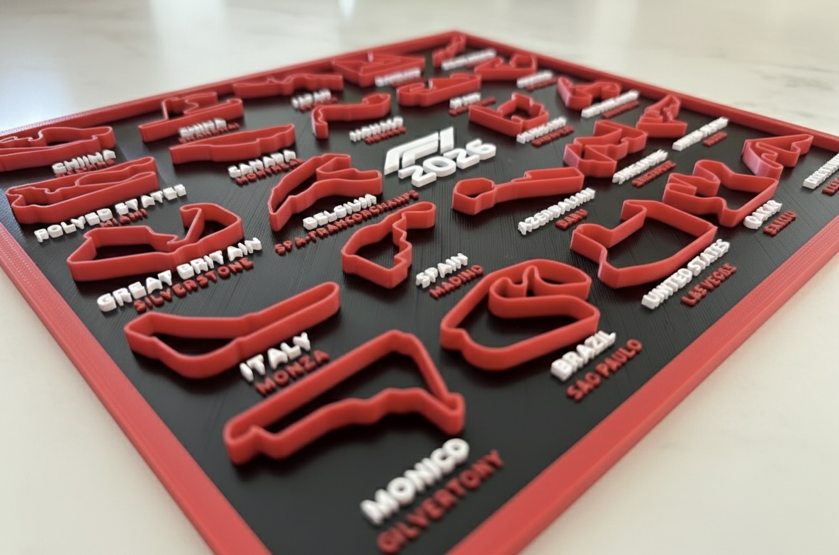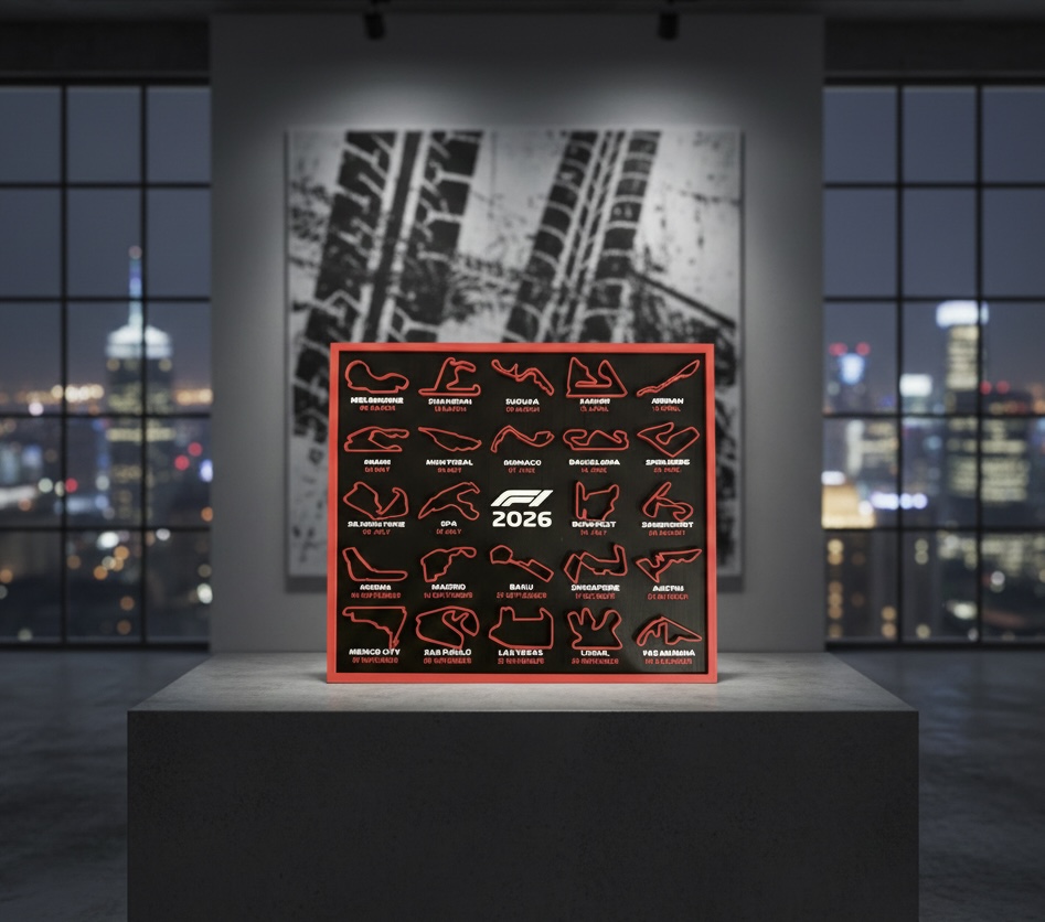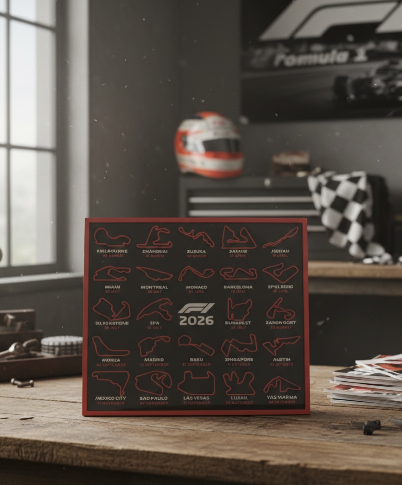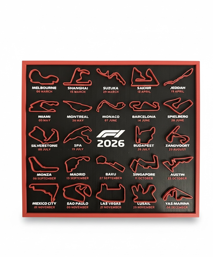 Calendário decorativo com as pistas da temporada de Fórmula 1 de 2026, ideal para fãs que desejam acompanhar o campeonato de forma visual e organizada. Pode ser utilizado em secretárias, estantes ou áreas de trabalho, aliando funcionalidade e paixão pelo automobilismo. Impresso em PLA sustentável.