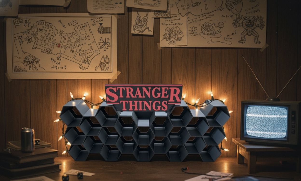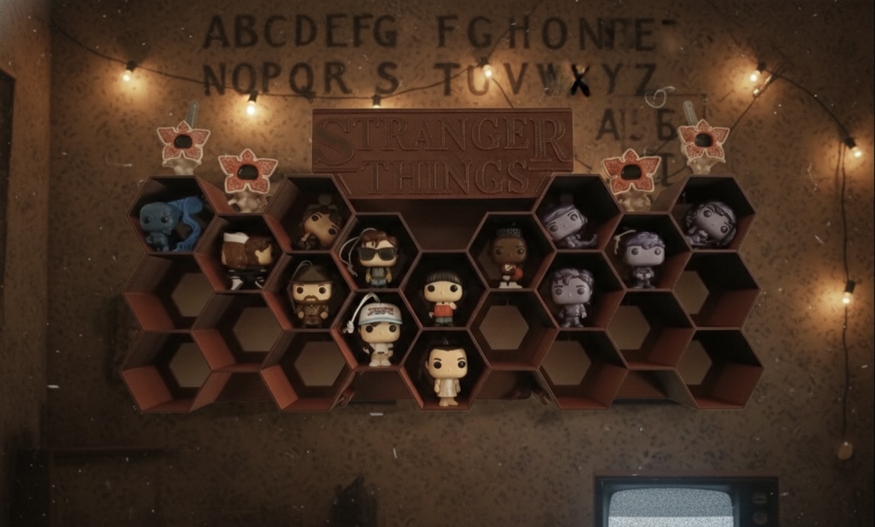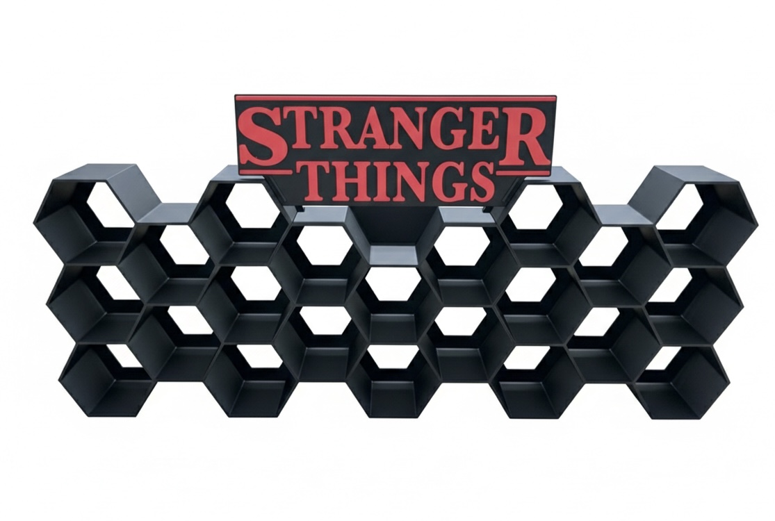 Expositor em formato colmeia desenvolvido para organizar figuras Kinder Joy da coleção Stranger Things de forma criativa e visualmente impactante. Ideal para colecionadores que procuram uma exposição diferenciada, aproveitando melhor o espaço e valorizando cada miniatura. Impresso em PLA sustentável.