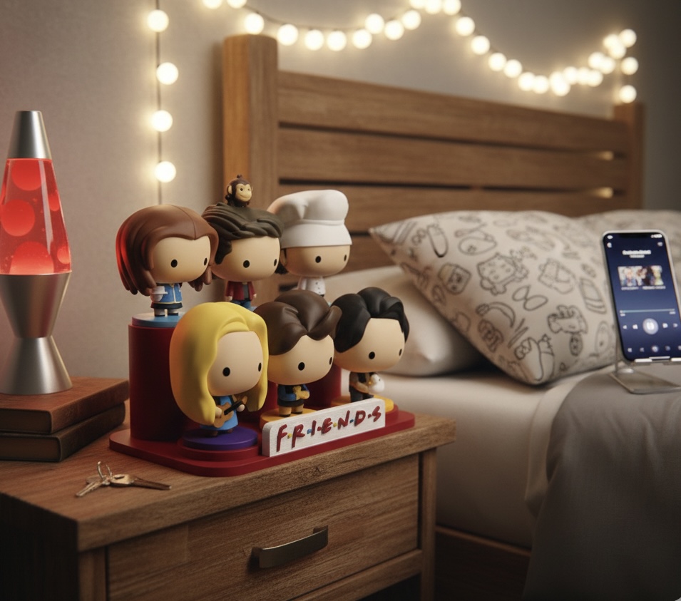 Figuras colecionáveis da série Friends numa mesa de cabeceira de madeira com candeeiro lava e cama ao lado