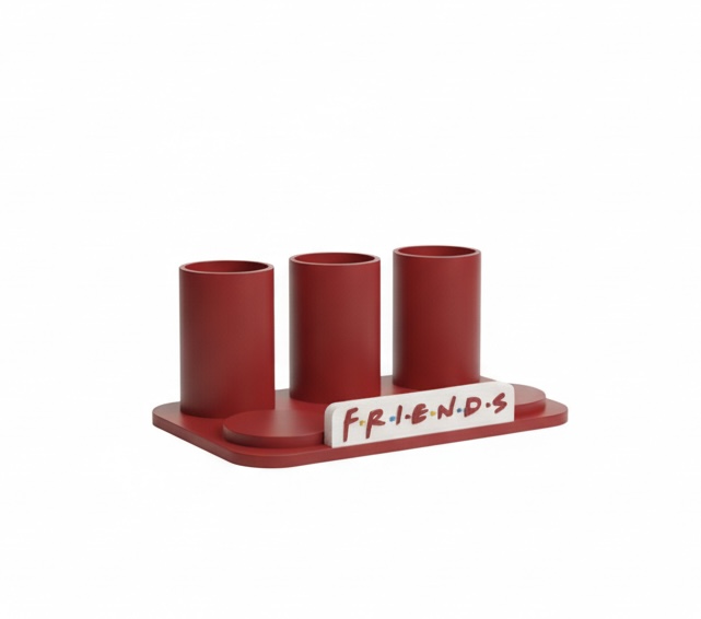 Suporte organizador vermelho com três cilindros e placa FRIENDS