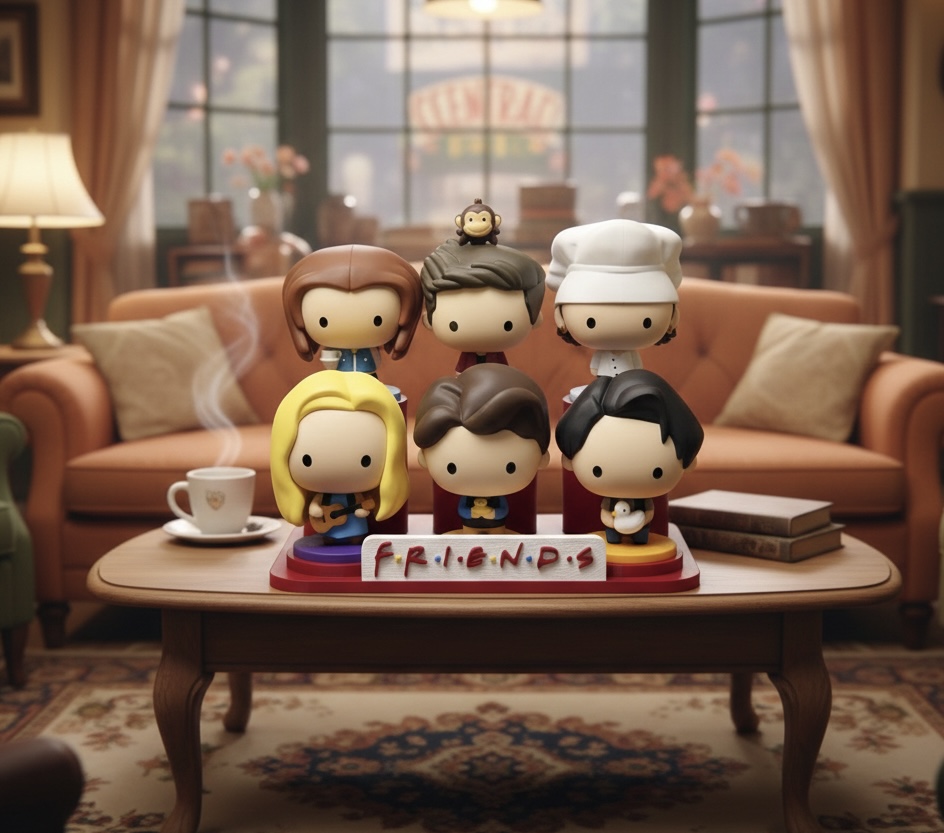 Bonecos colecionáveis Friends numa mesa em sala de estar