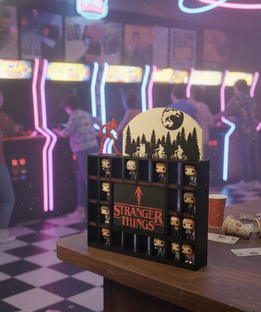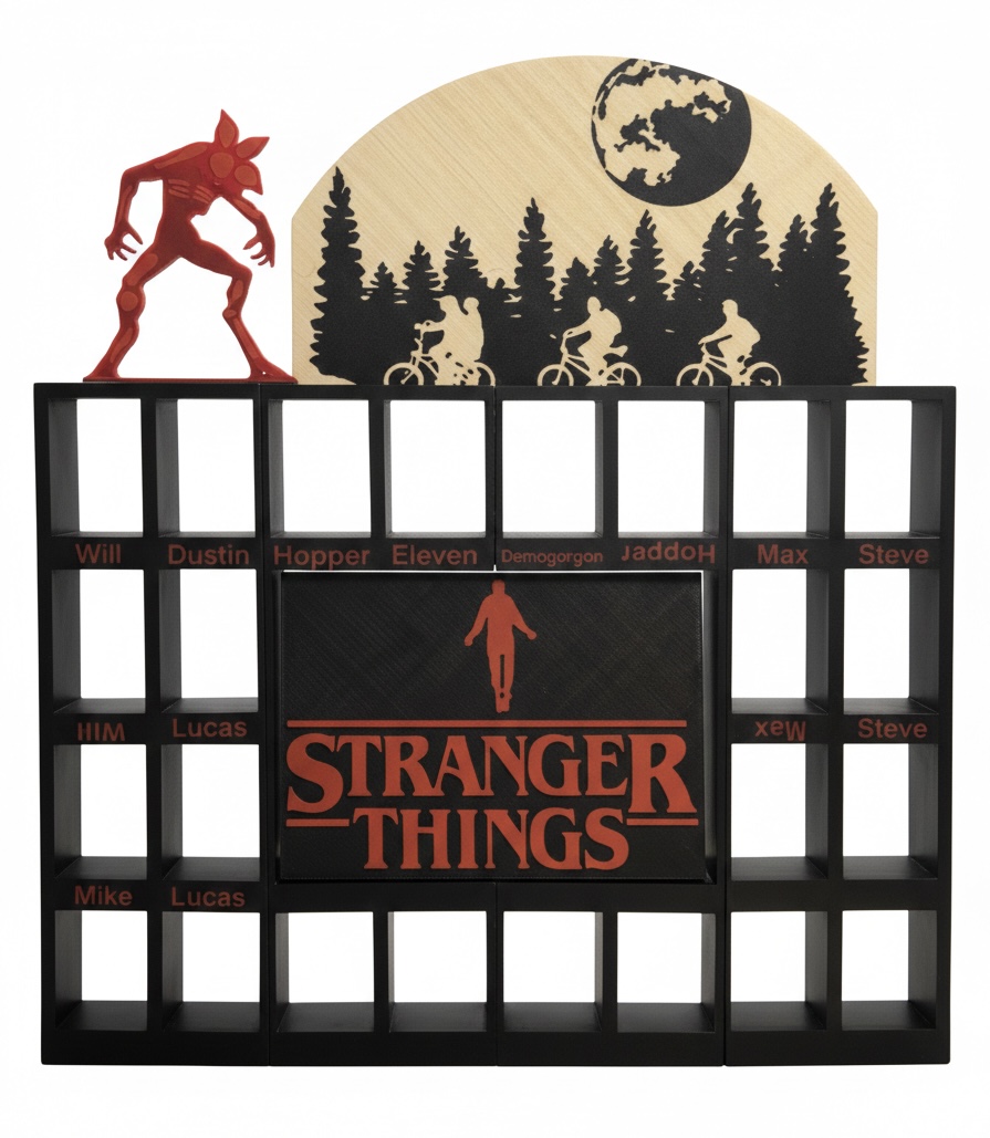 Expositor temático inspirado no cenário da floresta de Stranger Things, desenvolvido para organizar e valorizar figuras Kinder Joy da coleção. Cria uma apresentação envolvente e imersiva, ideal para colecionadores que desejam destacar as miniaturas em prateleiras, estantes ou vitrines, transformando a coleção num elemento decorativo de impacto. Impresso em PLA sustentável.