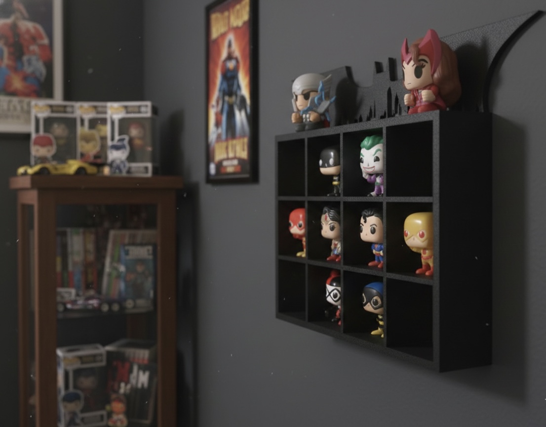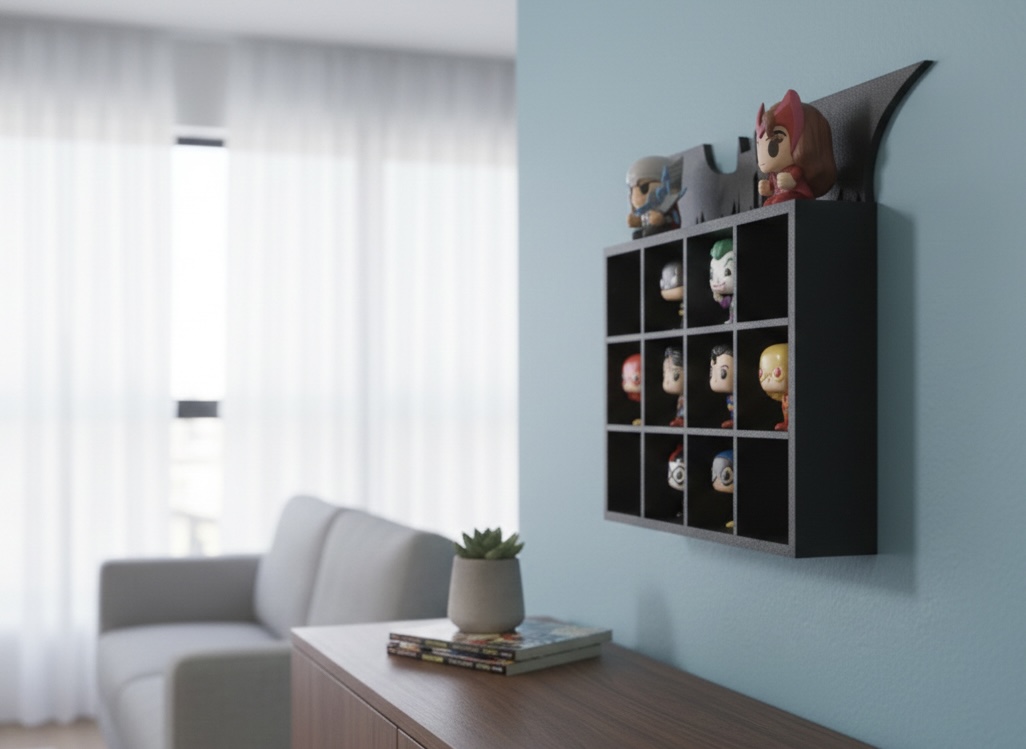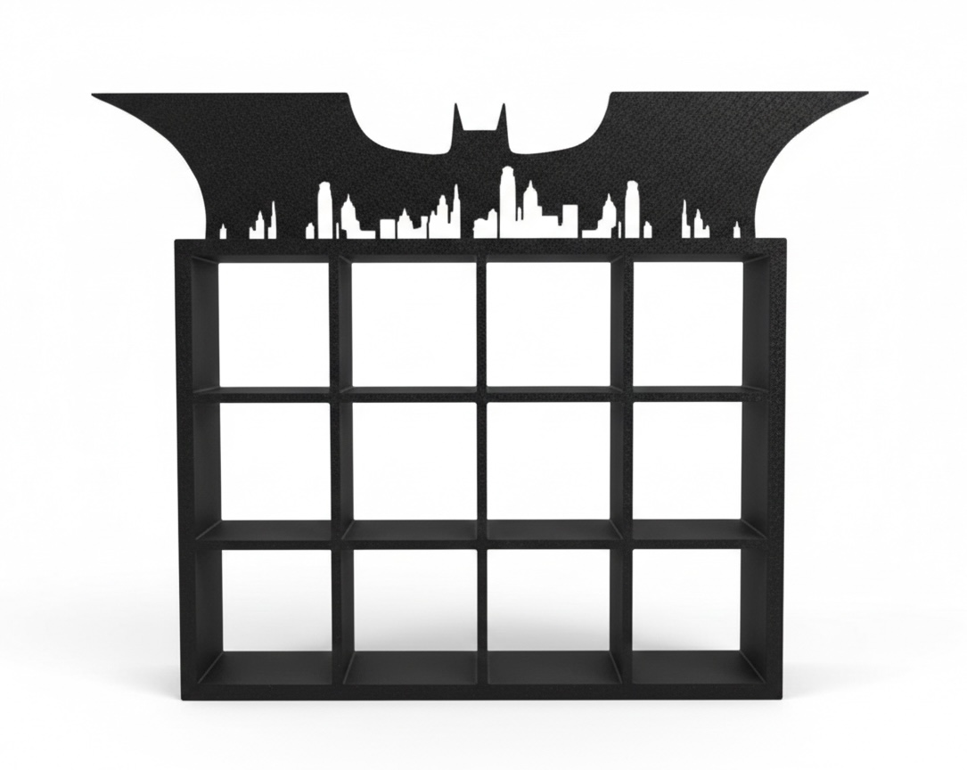Mini estante criada para colecionadores da coleção Batman DC Kinder Joy. Ideal para organizar e destacar os bonecos de forma temática, mantendo a coleção alinhada, visível e valorizada em estantes ou prateleiras. Impresso em PLA sustentável.