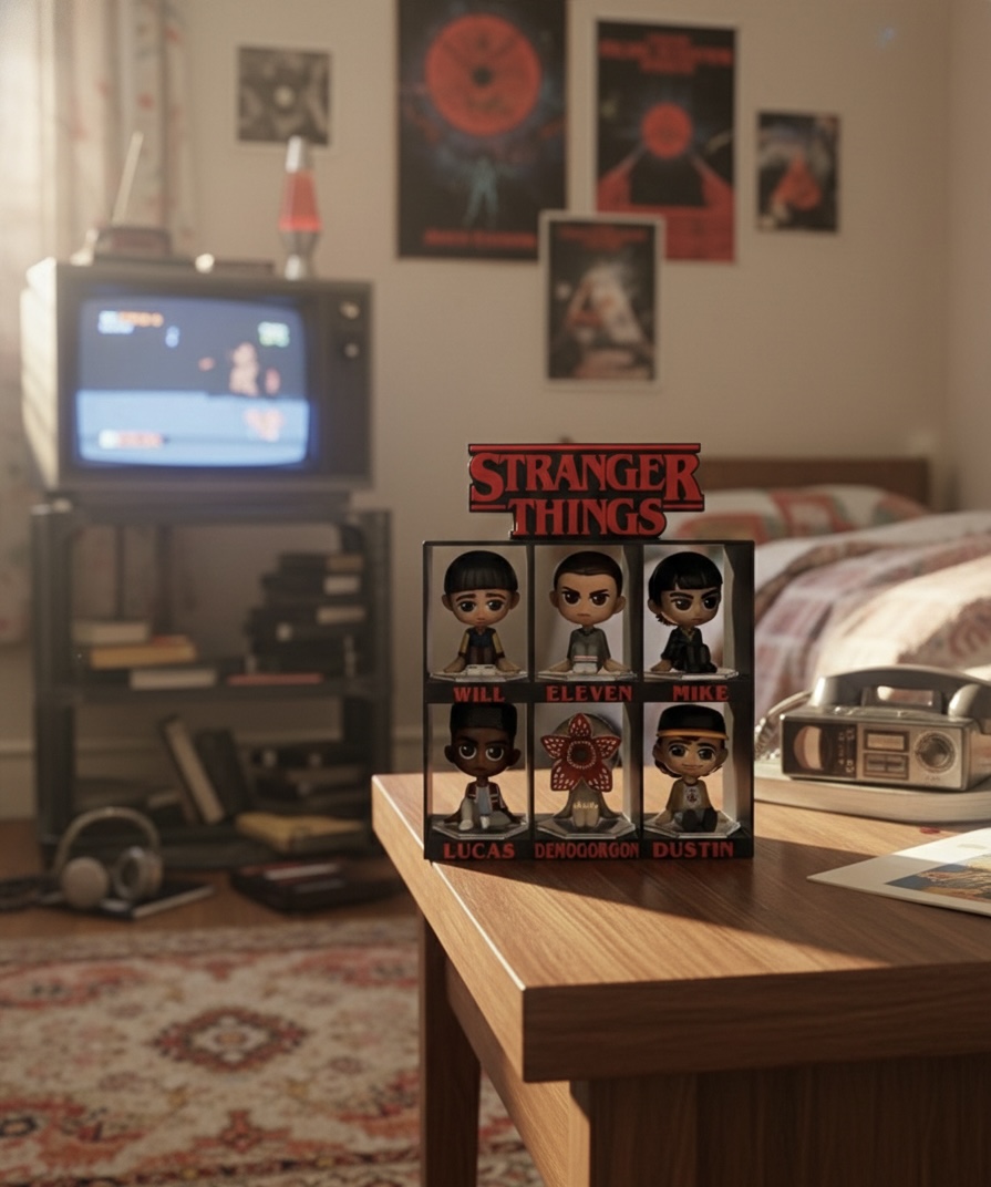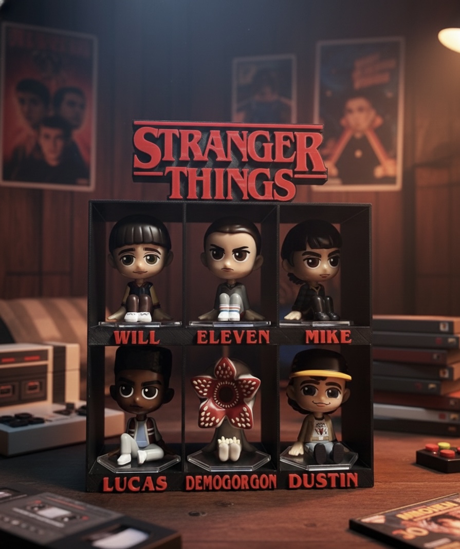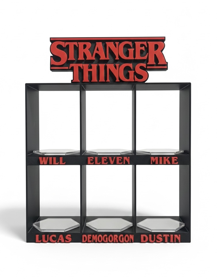 Expositor decorativo criado para figuras McDonald's e miniaturas da coleção Stranger Things, ideal para quem procura organização aliada a impacto visual. Permite destacar cada peça de forma equilibrada, valorizando a coleção e transformando qualquer espaço num ponto de destaque geek. Impresso em PLA sustentável.