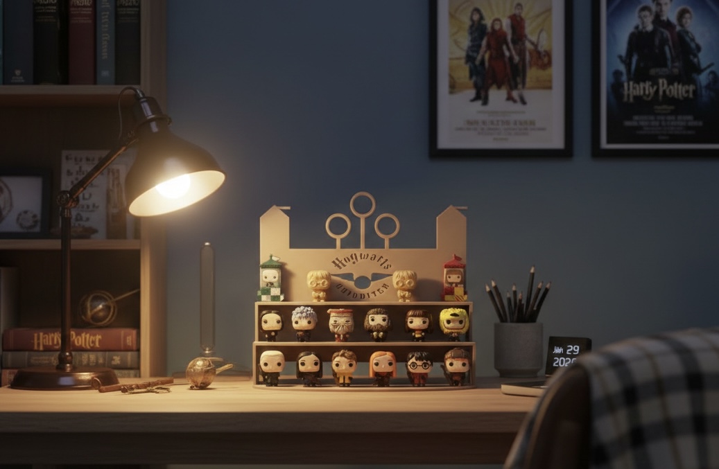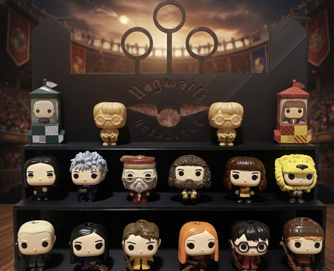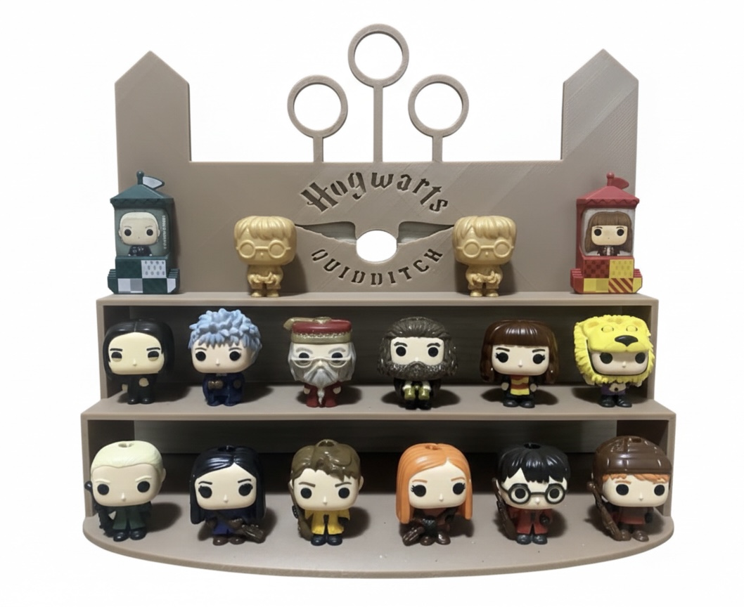 Expositor temático inspirado no quadribol, desenvolvido para figuras Kinder Joy da coleção Harry Potter. Organiza e valoriza as miniaturas com um design que remete ao universo mágico, ideal para fãs que desejam expor a coleção de forma criativa e harmoniosa em prateleiras ou vitrines. Impresso em PLA sustentável.