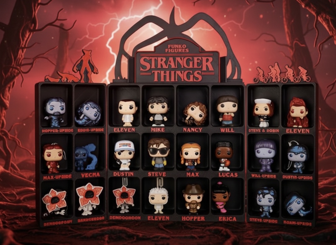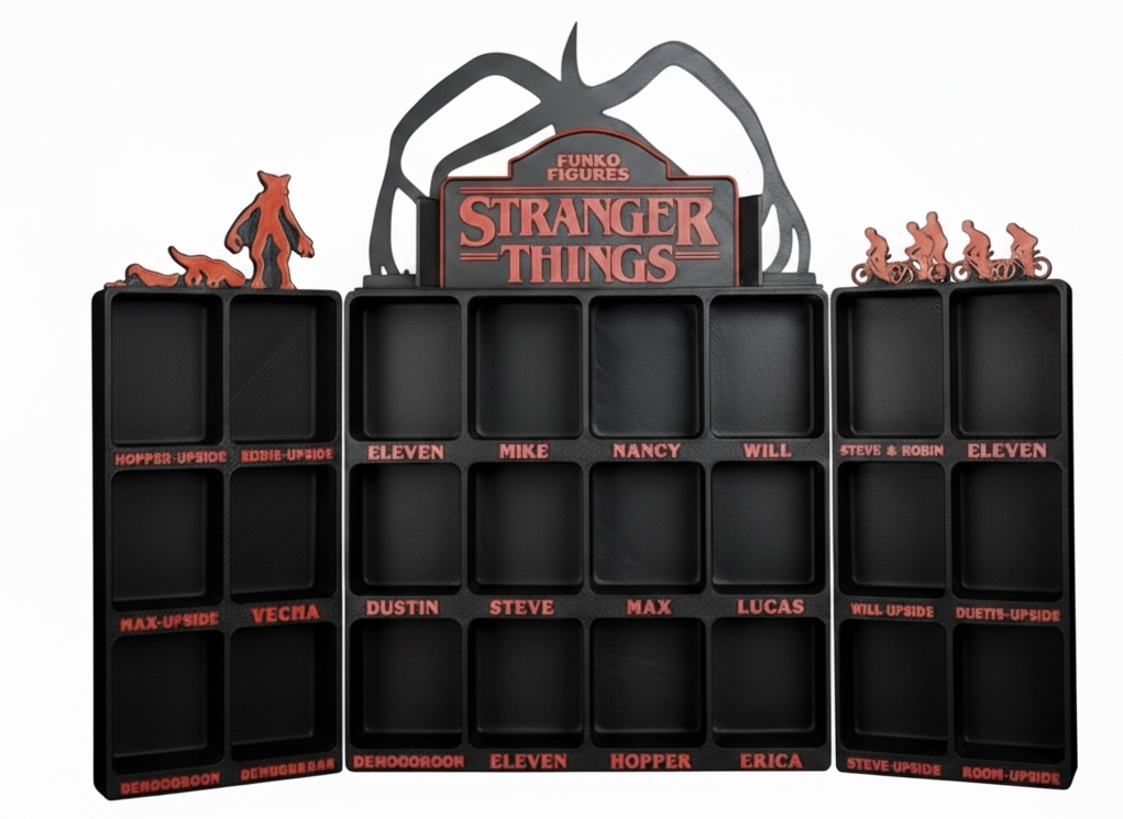 Expositor desenvolvido para organizar e valorizar figuras Kinder Joy da coleção Stranger Things, criando uma apresentação limpa, temática e visualmente impactante. Ideal para colecionadores que pretendem expor as miniaturas de forma organizada em prateleiras, estantes ou vitrines, transformando a coleção num verdadeiro destaque decorativo. Impresso em PLA sustentável.