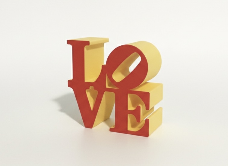 Escultura decorativa letras LOVE vermelhas e amarelas em fundo branco