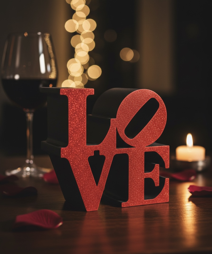 Escultura LOVE vermelha com glitter em mesa com vela, taça de vinho e pétalas vermelhas