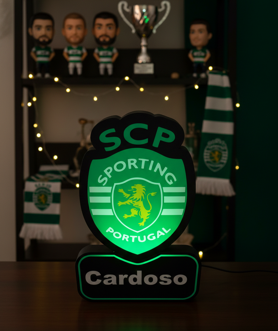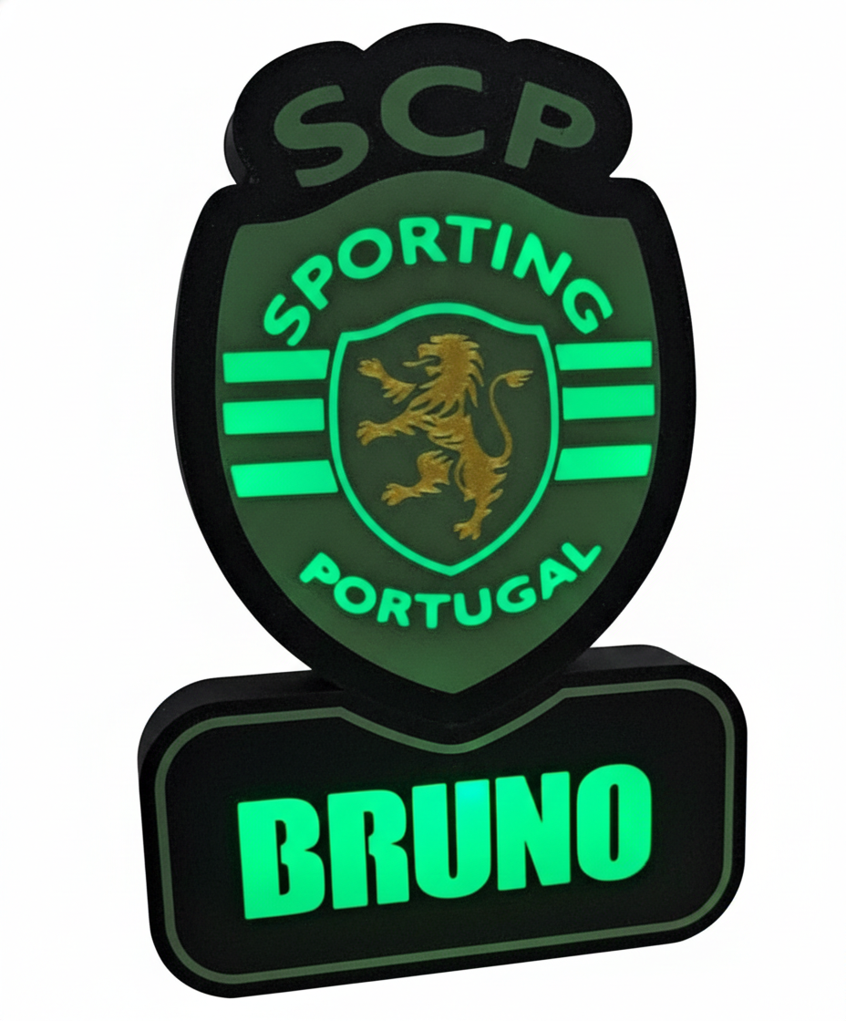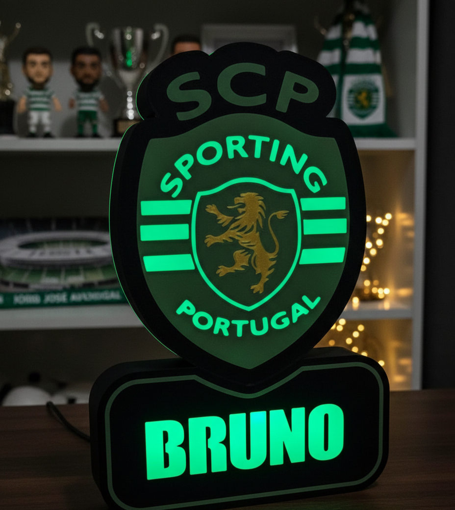 Luminária personalizada do Sporting Portugal, ideal para adeptos que desejam decorar o ambiente com identidade e paixão pelo clube. Perfeita para quartos, salas ou escritórios, combina iluminação decorativa com um design exclusivo e temático. Impresso em PLA sustentável.