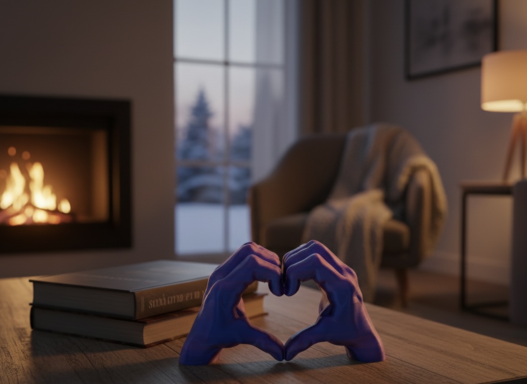 Escultura de mãos azuis formando um coração numa mesa com livros e lareira ao fundo