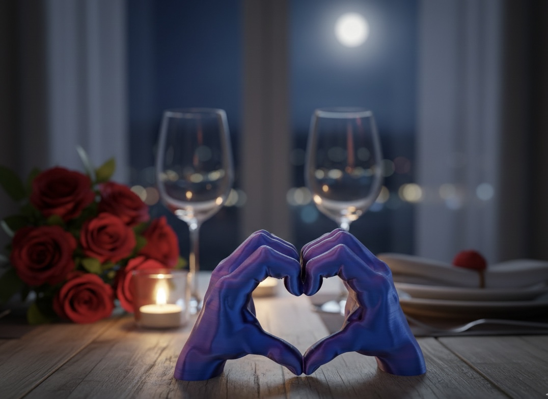 Escultura de mãos azuis formando um coração numa mesa com flores, velas e taças à noite