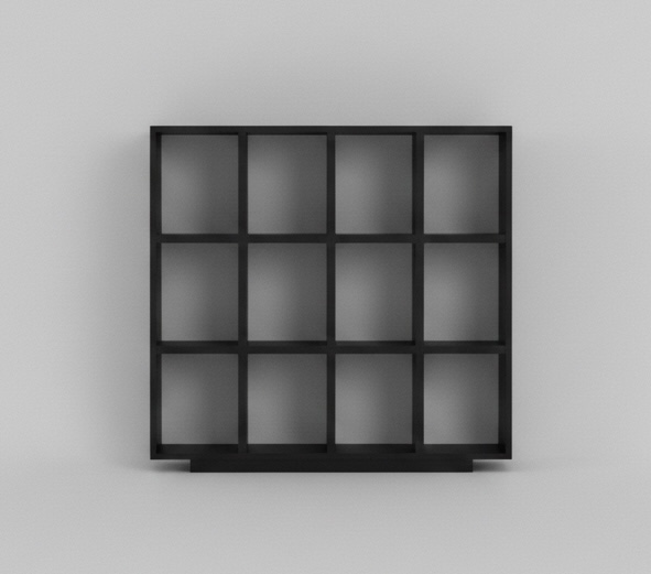 Estante preta quadrada com 16 nichos em ambiente cinzento