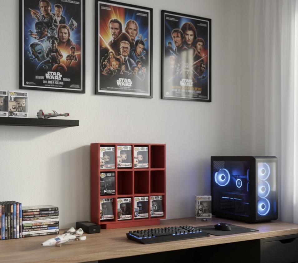 Mesa de madeira com teclado, rato, caixa PC iluminada, estante vermelha com figuras Funko Pop, posters Star Wars e cortinas brancas.