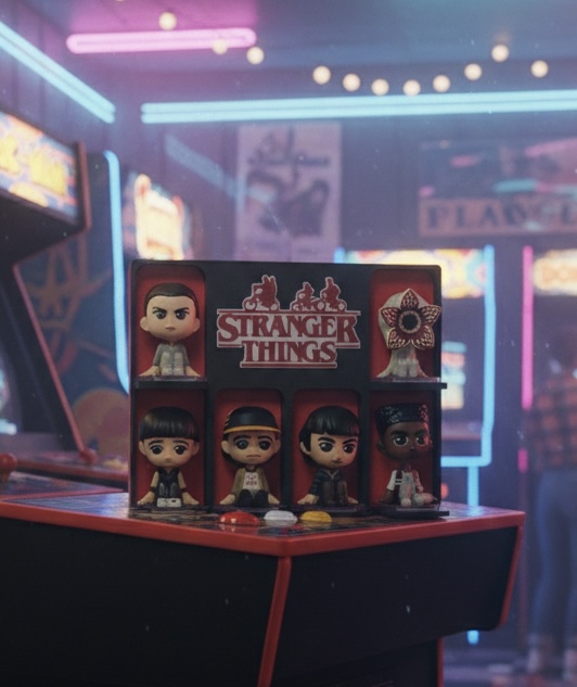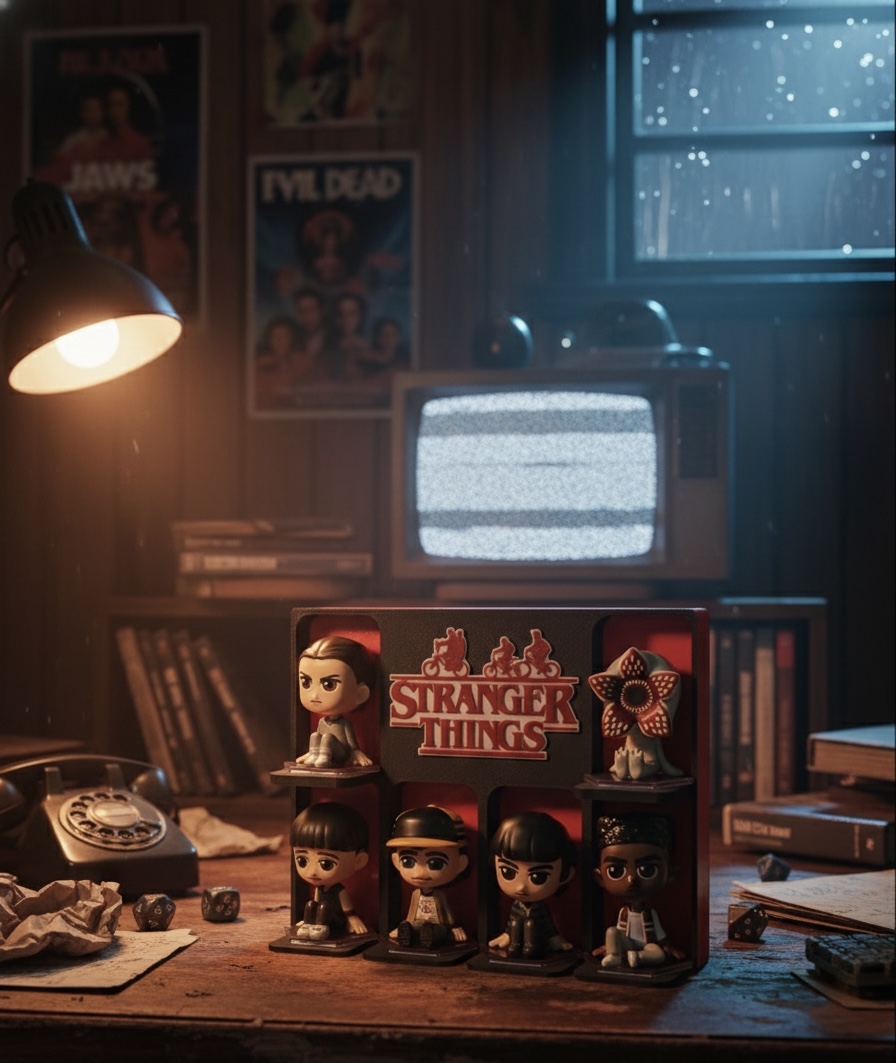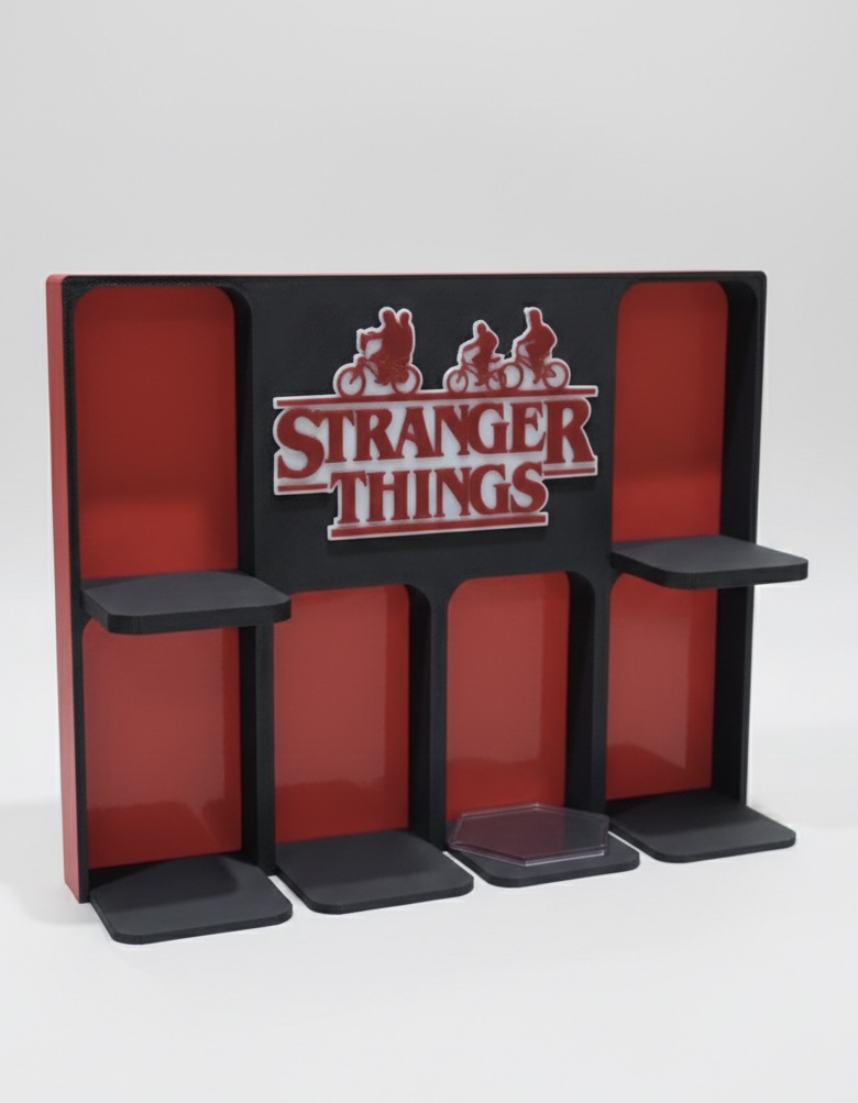 Expositor desenvolvido para organizar e valorizar figuras promocionais da coleção Stranger Things McDonald’s. Permite expor as miniaturas de forma clara e organizada, transformando a coleção num destaque visual em prateleiras, vitrines ou espaços geek. Impresso em PLA sustentável.