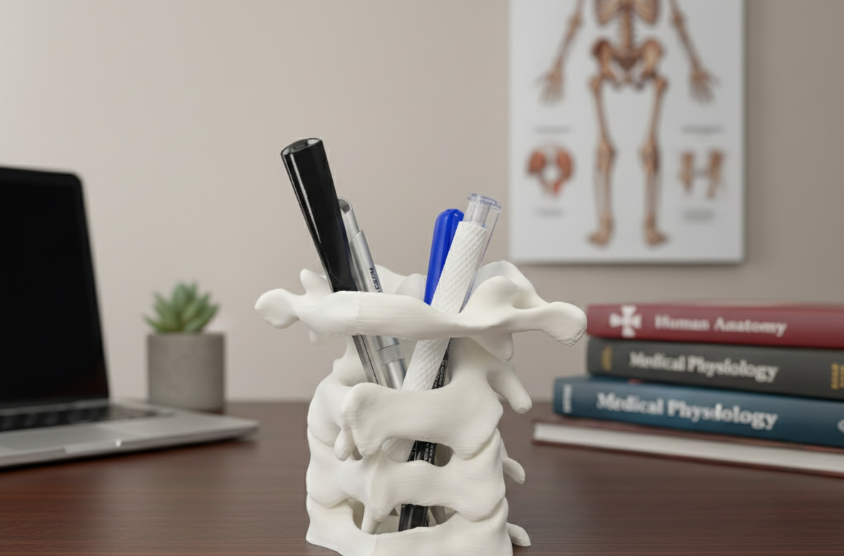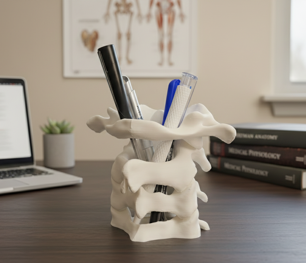 Suporte para canetas com design inspirado na coluna cervical, ideal para quem gosta de objetos criativos e funcionais. Perfeito para secretárias, escritórios ou consultórios, mantém canetas organizadas enquanto adiciona um toque moderno e diferenciado ao ambiente. Impresso em PLA sustentável.