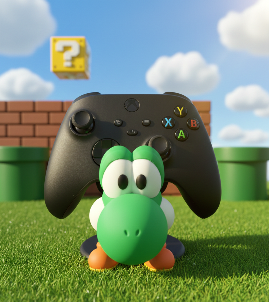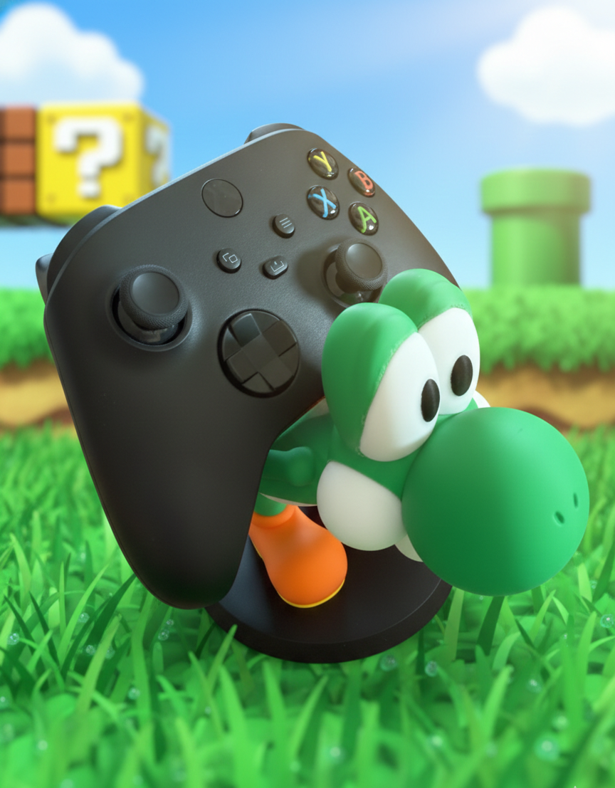 Suporte temático inspirado no Yoshi da franquia Mario Bros, ideal para fãs de jogos que querem organizar o comando de forma divertida e funcional. Perfeito para setups gamers, secretárias ou estantes, mantém o comando seguro, acessível e ainda adiciona personalidade ao ambiente. Impresso em PLA sustentável.