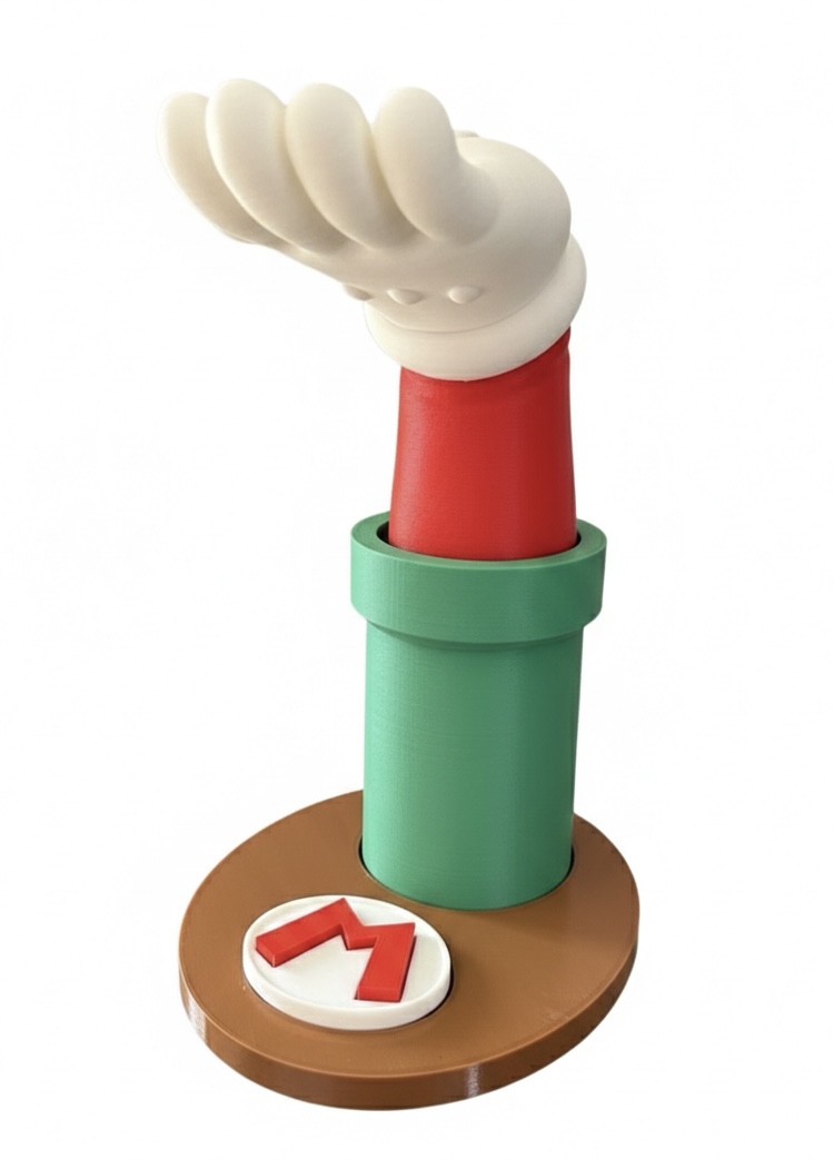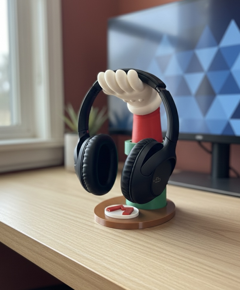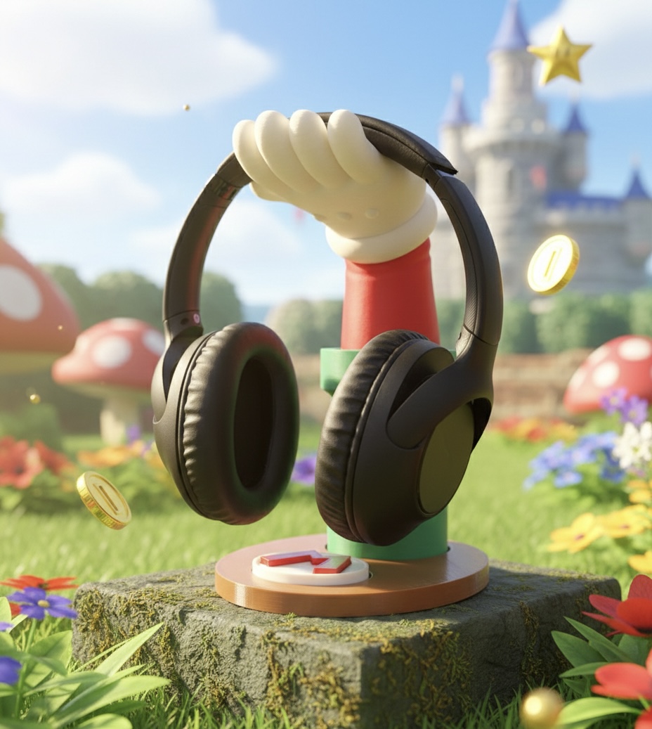 Suporte temático inspirado no universo Mario Bros, criado para apoiar Headset  de forma segura e organizada. Ideal para setups gamer que unem funcionalidade e decoração, mantendo o espaço limpo e estilizado. Impresso em PLA sustentável.