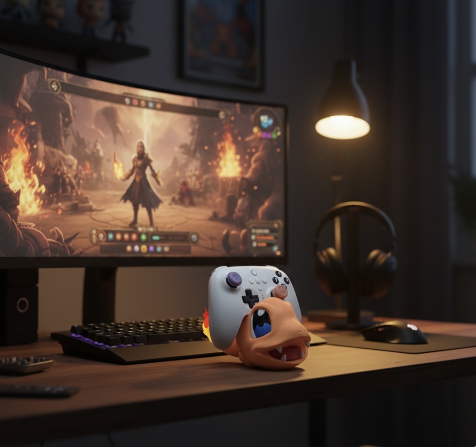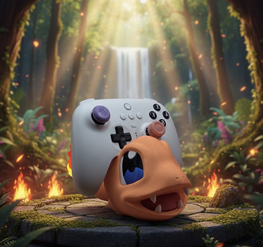 Suporte decorativo e funcional inspirado no Charmander, ideal para manter o comando organizado e dar destaque ao setup gamer ou à coleção Pokémon. Ajuda a evitar que o comando fique pousado de forma desordenada, valorizando o espaço com um toque temático. Impresso em PLA sustentável.