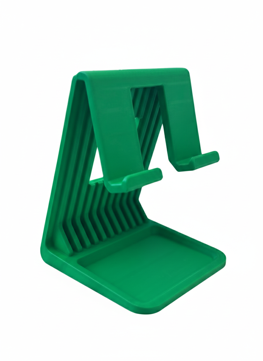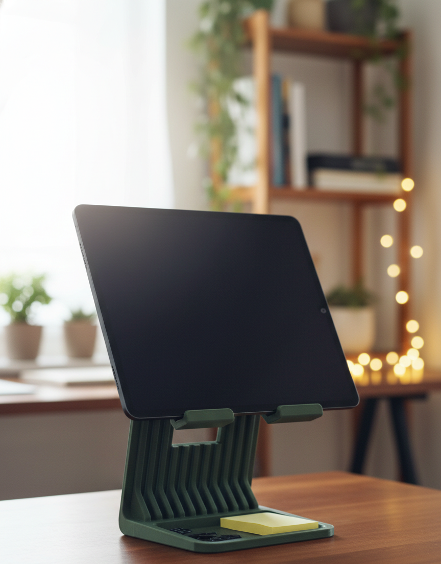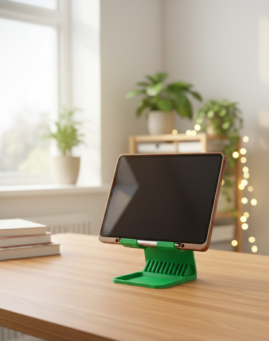 Suporte funcional para tablet e iPad, ideal para quem utiliza dispositivos móveis para trabalho, estudo ou entretenimento. Perfeito para secretárias, cozinhas ou mesas de apoio, mantém o dispositivo estável, numa posição confortável para visualização e uso diário. Impresso em PLA sustentável.