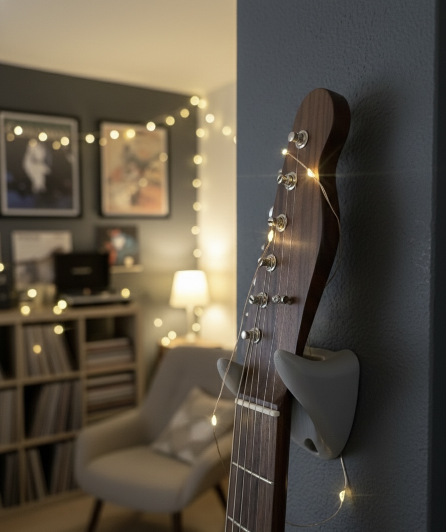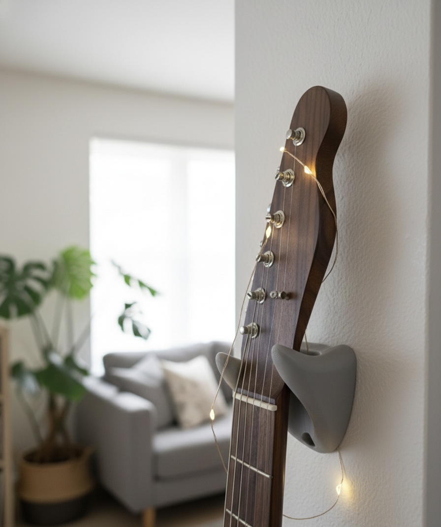 Suporte funcional para músicos que desejam organizar e proteger seus instrumentos. Ideal para quartos, estúdios ou salas, mantém violão ou guitarra acessíveis e bem posicionados, valorizando o ambiente, impresso em PLA sustentável.