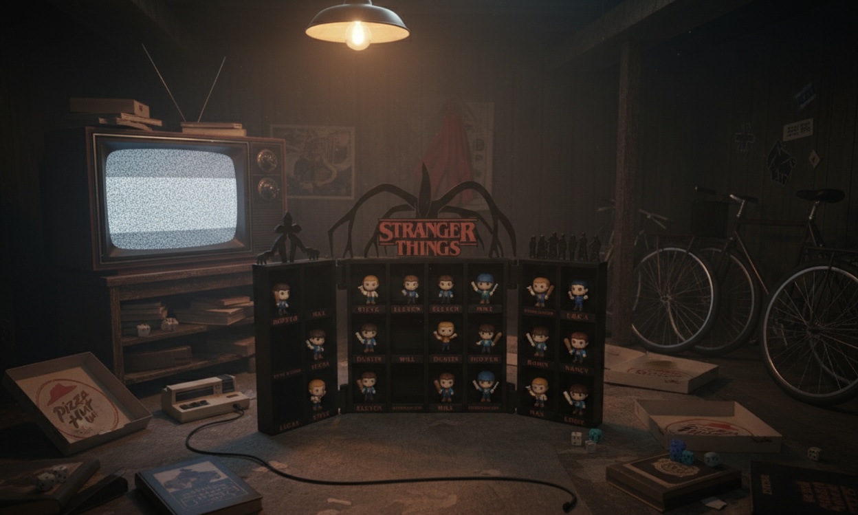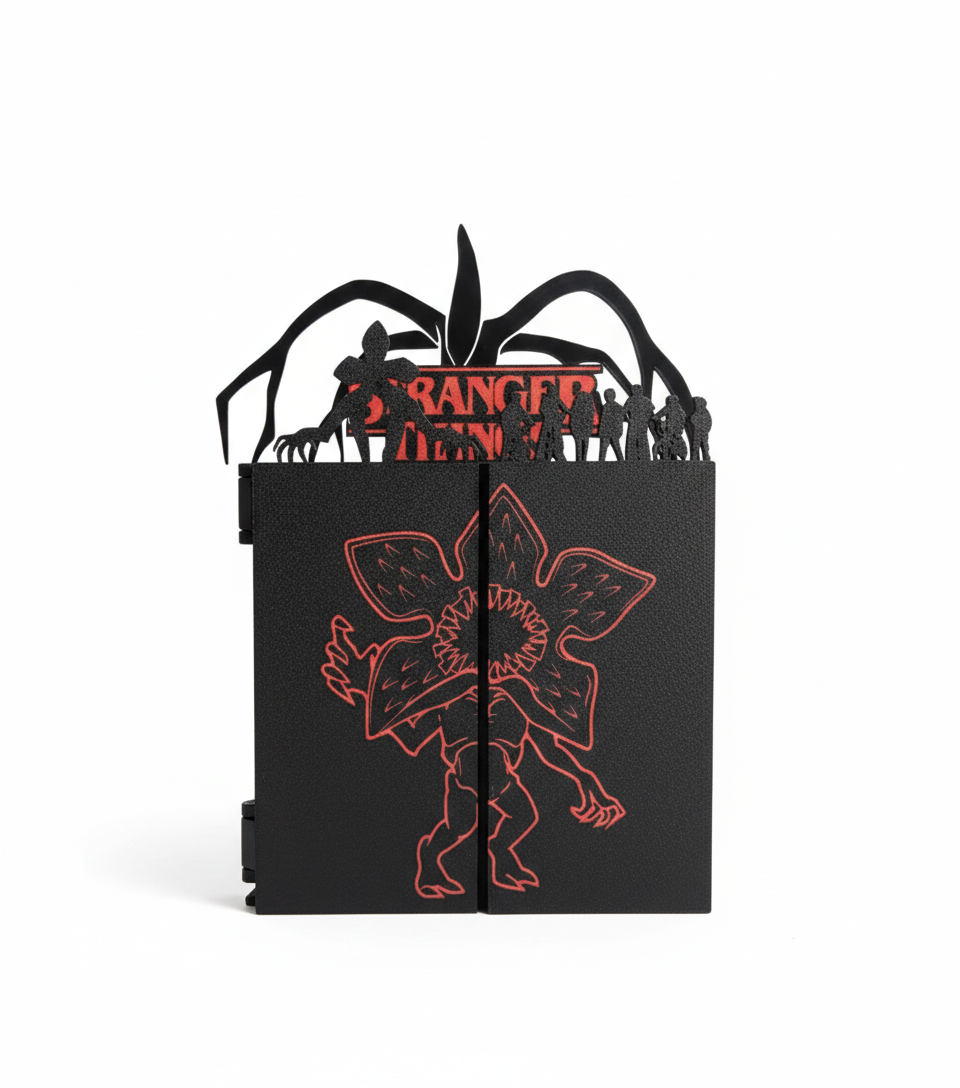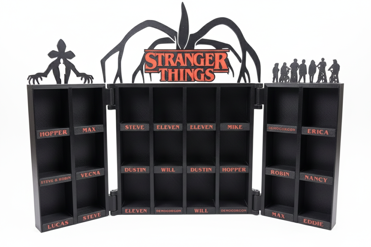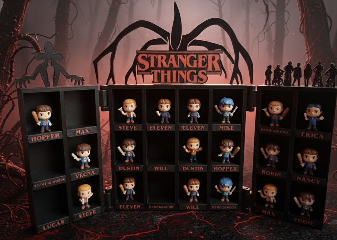 Expositor em formato maior, pensado para colecionadores de bonecos Kinder Joy da coleção Stranger Things que procuram mais capacidade e impacto visual. Ideal para quem tem várias figuras e quer expô-las de forma organizada, segura e com destaque decorativo. Impresso em PLA sustentável.