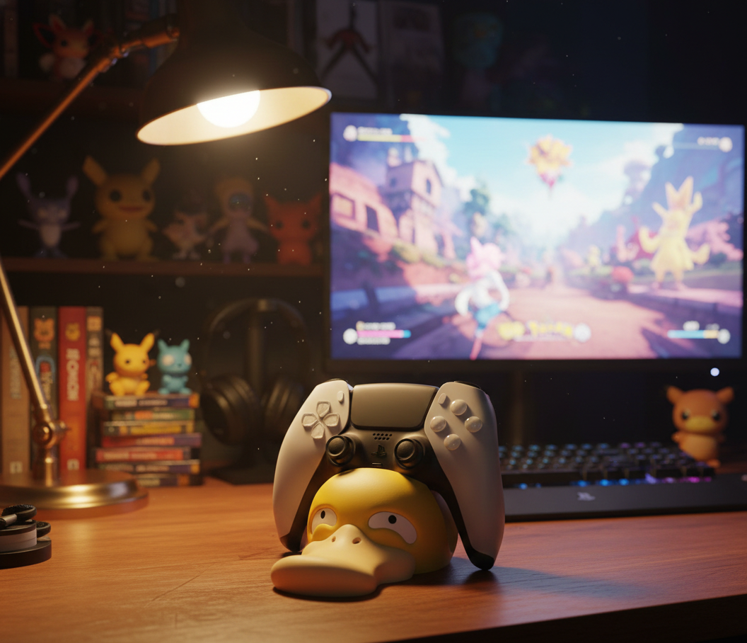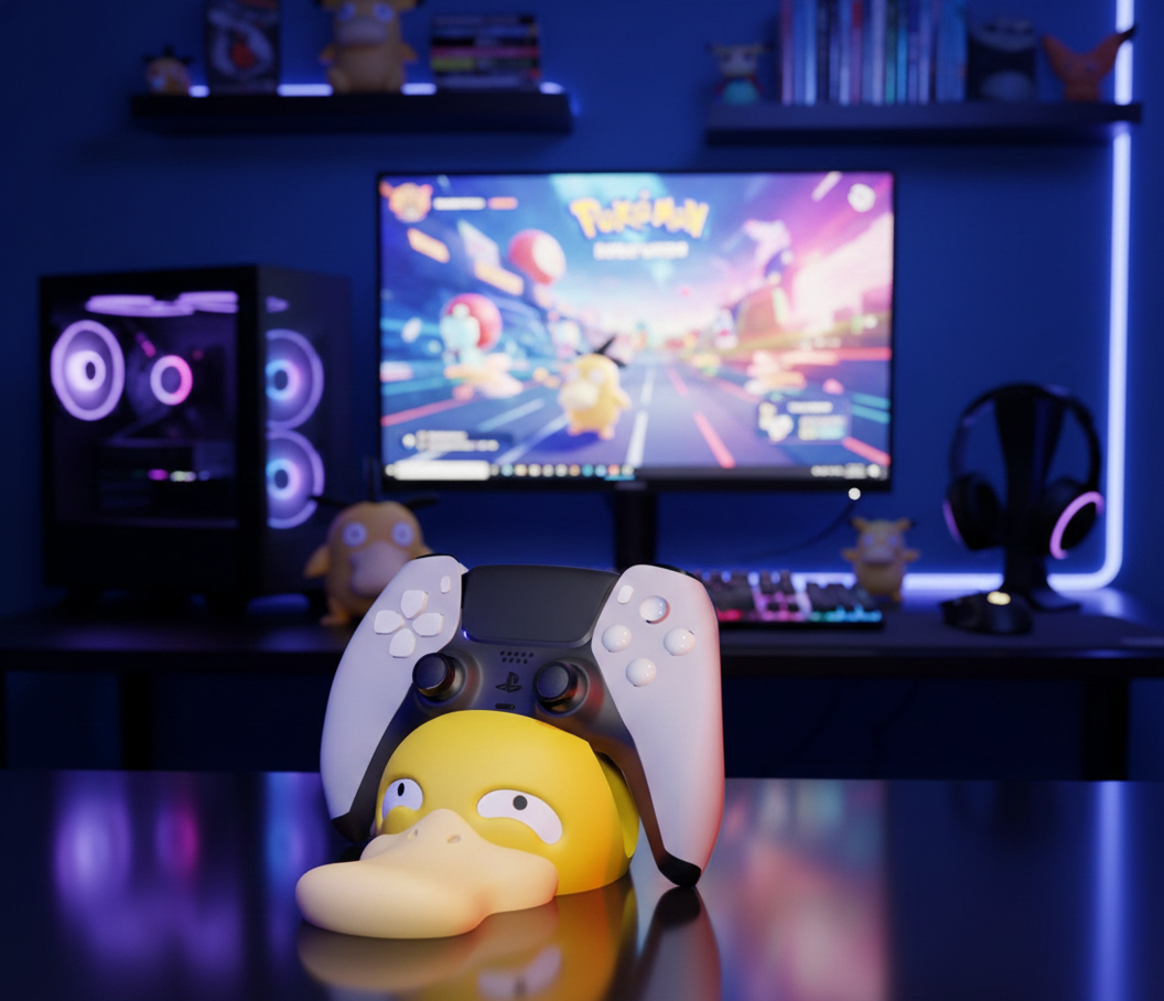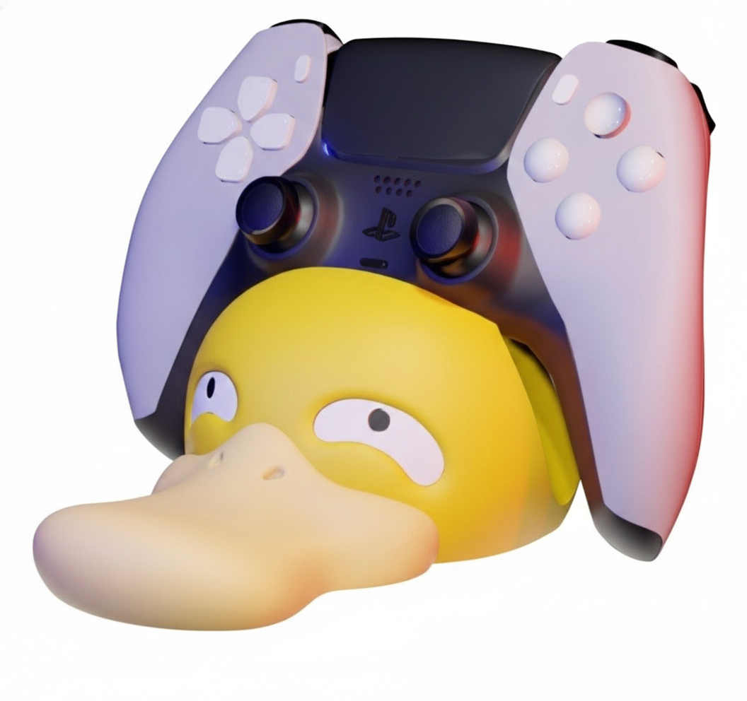 Suporte temático inspirado no Psyduck, ideal para fãs de Pokémon que desejam organizar comandos de videojogos de forma prática e divertida.