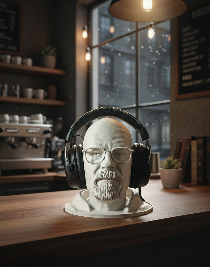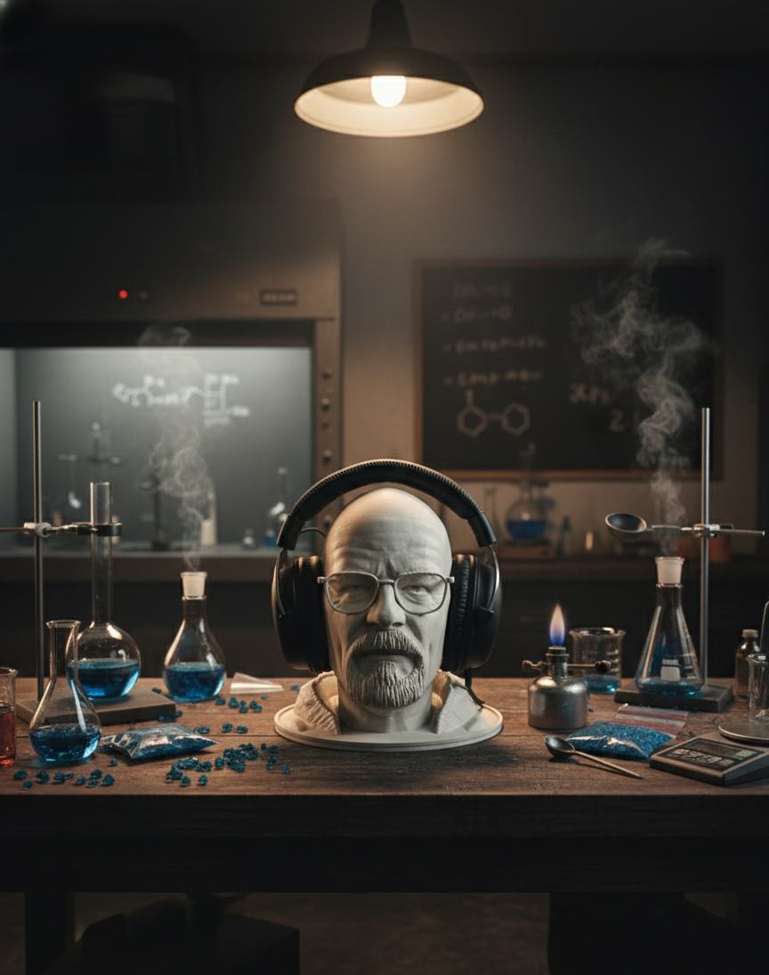 Suporte temático inspirado na série Breaking Bad, ideal para fãs que desejam guardar os auscultadores de forma organizada e com personalidade. Perfeito para secretárias, setups gamers ou escritórios, evita fios embolados e valoriza o ambiente com um elemento decorativo marcante. Impresso em PLA sustentável.