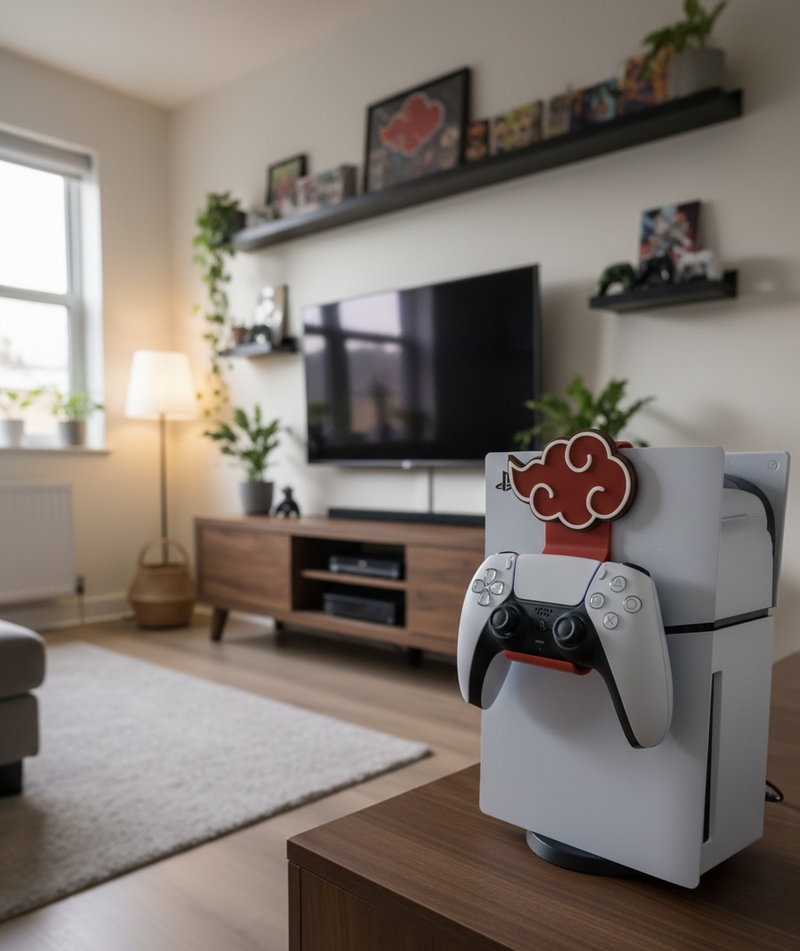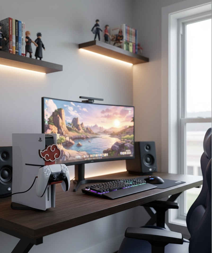 Suporte vertical para comando com design inspirado em Naruto, pensado para gamers que querem unir funcionalidade e estilo no setup. Permite manter o comando bem apoiado, organizado e protegido quando não está em uso. Impresso em PLA sustentável.